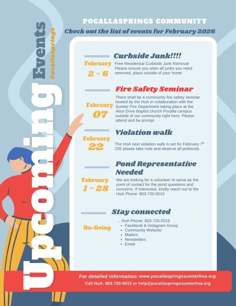 Your HOA Board is here to serve you and support the well-being of our neighborhood. Please feel free to reach out to us with any concerns, questions, or suggestions by email at help@pocallaspringssumterhoa.org, or PocallaSpringsHOA2@gmail.com, or by text/call at 839-867-4645. We are committed to keeping our community informed, connected, and thriving.