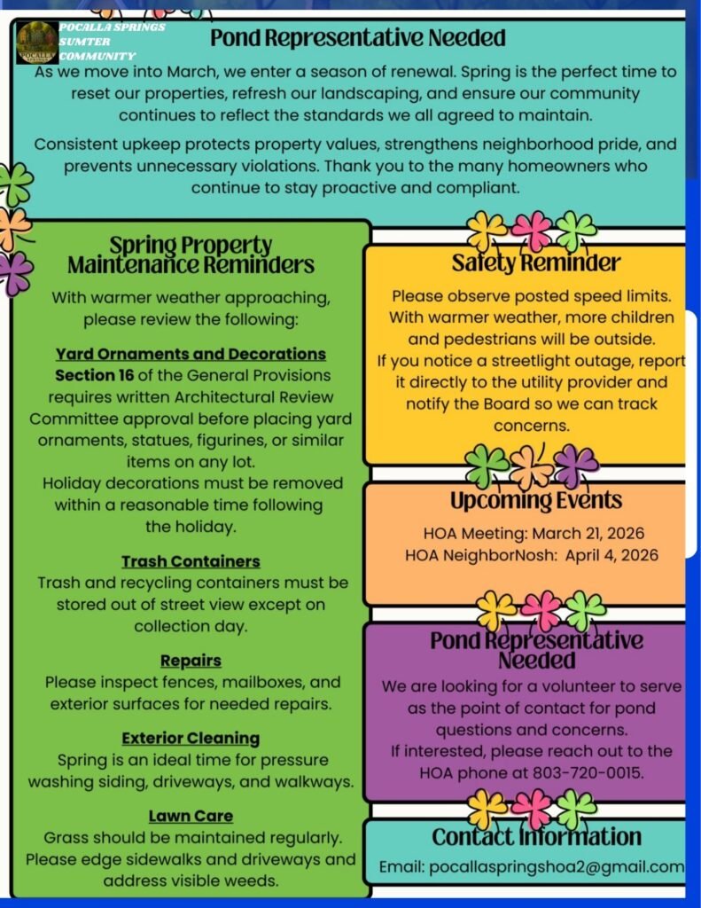 This is the official Pocalla Springs HOA page for the neighborhood. We will share announcements and concerns related only to HOA matters in this group. Any homeowners in Pocalla Springs (whether physically living here or living elsewhere) are welcome to join this group. When you request to join, please answer the questions so we can verify you are a homeowner. Renters are welcome to join the other neighborhood page. Please address any HOA questions or concerns to the Pocalla Springs Board of Directors at pocallaspringshoa2@gmail.com. HOA Board – 839-867-4645, email: help@pocallaspringssumterhoa.org