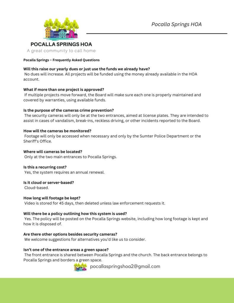 This is the official Pocalla Springs HOA website for the neighborhood. We will share announcements and concerns related only to HOA matters one this site and in the FB page. Any homeowners in Pocalla Springs (whether physically living here or living elsewhere) are welcome to join this group. When you request to join, please answer the questions so we can verify you are a homeowner. Renters are welcome to join the other neighborhood page. Please address any HOA questions or concerns to the Pocalla Springs Board of Directors at pocallaspringshoa2@gmail.com. Questions or concerns concerning dues or ARC requests can be directed to our management company: HOA Services of Sumter – 839-867-4645 or (803) 469-2100 or PocallaSpringsHOA2@gmail.com or help@pocallaspringssumterhoa.org. They are located at 2990 Broad St. Sumter, SC 29150